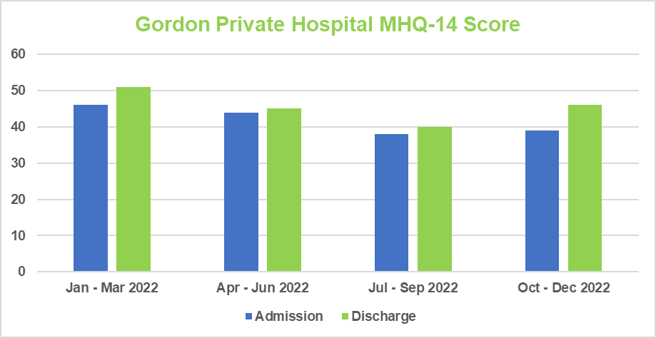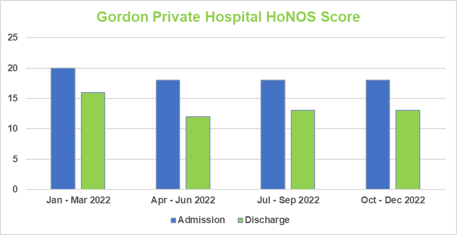 The charts below show the results for Gordon Private Hospital’s HoNOS and MHQ-14scores for 2022.
